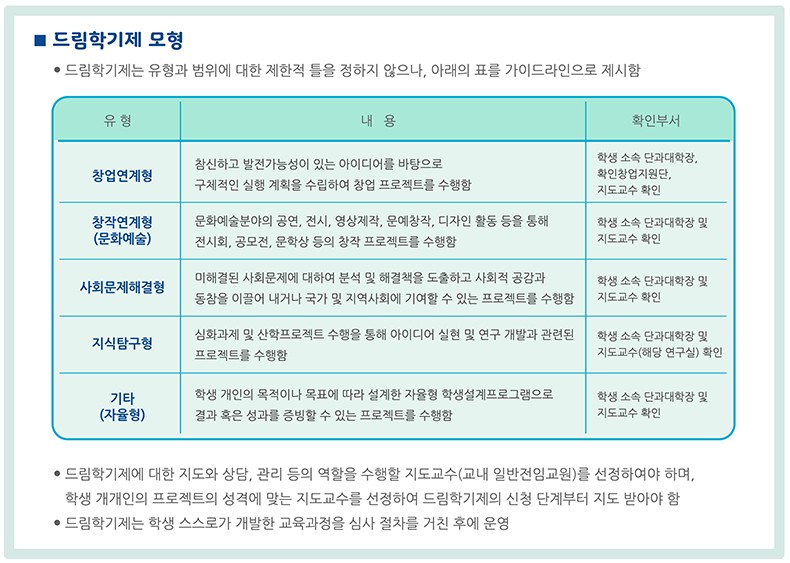 드림학기제는 창업연계형, 창작연계형(문화예술), 사회문제해결형, 지식탐구형, 기타(자율형)의 총 5단계 모형으로 나뉩니다.