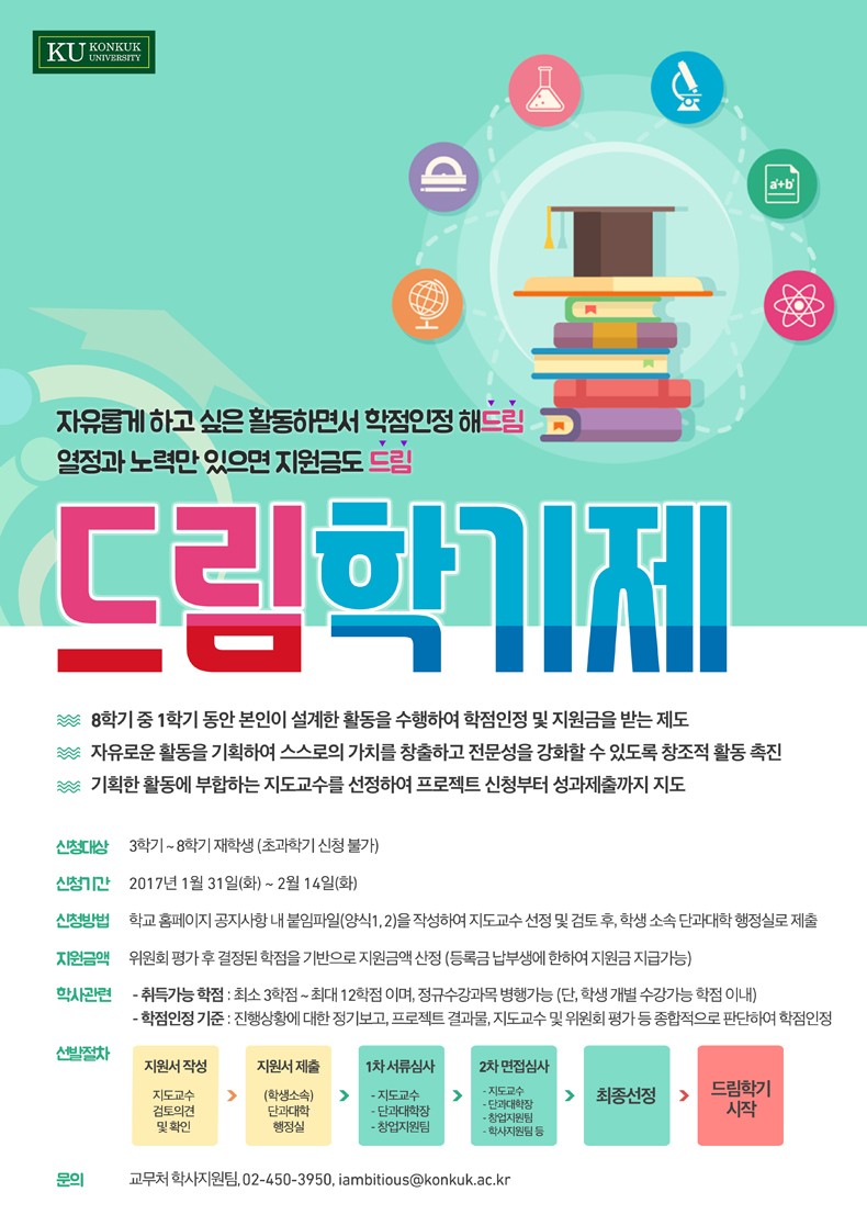 마지막은 건국대학교의 드림학기제입니다. 드림학기제는 2017년도 1학기에 도입되었는데요. 현장 실무를 통해 학기를 이수하는 다양한 PLUS학기제도 가운데 하나입니다. 학생이 직접 창의적 활동 과제를 설계하고 제안하여 수행함으로써 진로에 대한 방향을 설정함은 물론 자신감을 가질 수 있도록 한 프로그램이죠.