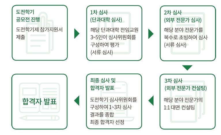 도전학기제의 심사과정은 먼저 참가 지원서를 제출하고 1차 단과대학 심사를 거친 후, 2차에서 외부 전문가 심사를 받습니다. 3차 심사를 통해 외부 전문가의 컨설팅을 받고, 마지막으로 도전 학기 심사위원회를 통해 1~3차 심사 결과를 종합하는 최종 심사를 거쳐 합격자를 발표한답니다. 여러 번의 심사과정을 거치는 만큼 선발된 학생은 우수한 활동을 펼칠 수밖에 없답니다. 도전 학기제의 진행 과정은 아래 이미지를 참고하세요.