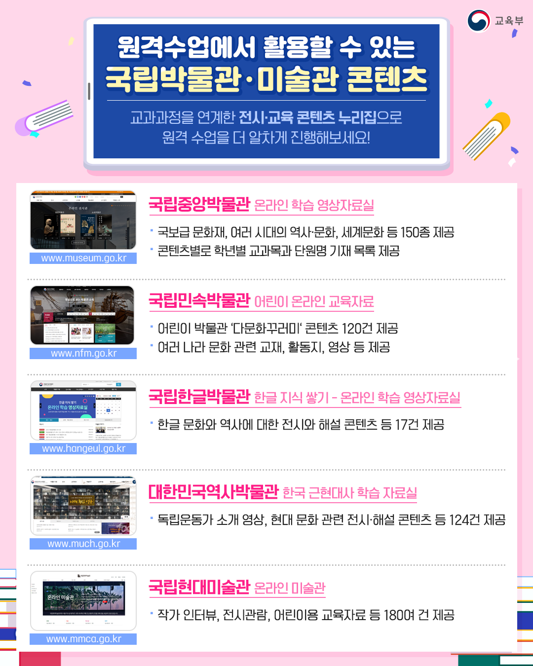 교과과정을 연계한 전시·교육 콘텐츠 누리집으로 원격수업을 더 알차게 진행해보세요~ 👏