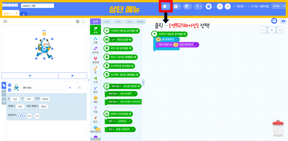 화면 상단 메뉴에서 첫 번째 버튼을 클릭하여 언어의 종류(블록코딩, 엔트리파이선) 중 ‘엔트리파이선’모드를 선택합니다.