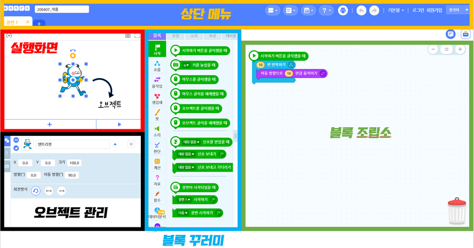 엔트리 기본 화면입니다. 화면은 상단 메뉴, 실행 화면, 오브젝트 관리, 블록 꾸러미, 블록 조립소로 구성되어 있습니다.