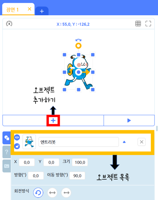 오브젝트란 명령어 블록으로 코딩하여 제어할 수 있는 대상입니다. 위 사진은 엔트리에서 기본값으로 설정되어 있는 오브젝트입니다. 기본 오브젝트 외에도, ‘오브젝트 추가하기’ 단추인 (+)를 클릭해 사람, 사물, 동물, 배경 등 엔트리에서 제공하는 다양한 오브젝트, 직접 그림판을 통해 그린 그림, 컴퓨터에 저장되어 있는 파일들을 실행 화면으로 불러올 수 있습니다. 같은 화면 내 여러 오브젝트들은 명령어 블록을 사용하여 각각 따로따로 코딩할 수 있습니다. 오브젝트를 코딩한 내용은 「블록 조립소」에서 확인할 수 있으며, ‘시작하기’ 버튼을 눌러 코딩 내용을 실행할 수 있습니다.