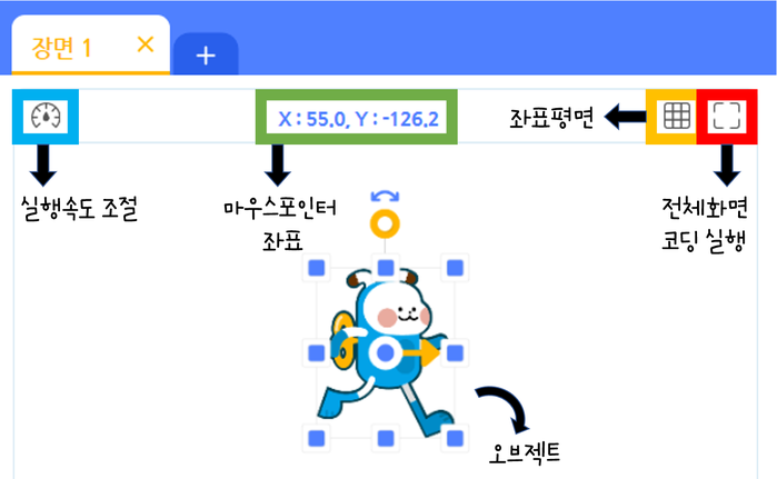 실행 화면에서는 코딩된 오브젝트를 확인할 수 있습니다. 속도 조절 단추를 클릭하여 코딩 실행 속도를 변경할 수 있으며, 컴퓨터 전체 화면에서 코딩 결과를 확인할 수 있습니다.