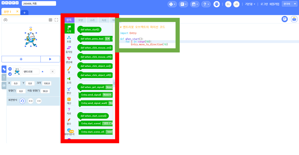 미국의 ‘스크래치’와 같은 블록형 프로그래밍 언어를 사용하여 자신만의 작품을 창작할 수 있습니다. 또 엔트리에서는 블록형 코딩 이외에도 [엔트리파이선모드]를 제공하고 있어, 코딩을 텍스트 언어와 연계하여 배울 수 있습니다.