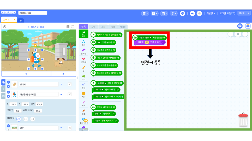 “가방을 멘 엔트리봇” 오브젝트에 코딩된 명령어 블록입니다. 키보드에서 오른쪽 화살표를 눌렀을 때, “가방을 멘 엔트리봇”이 오른쪽으로 이동할 수 있도록 코딩했습니다.