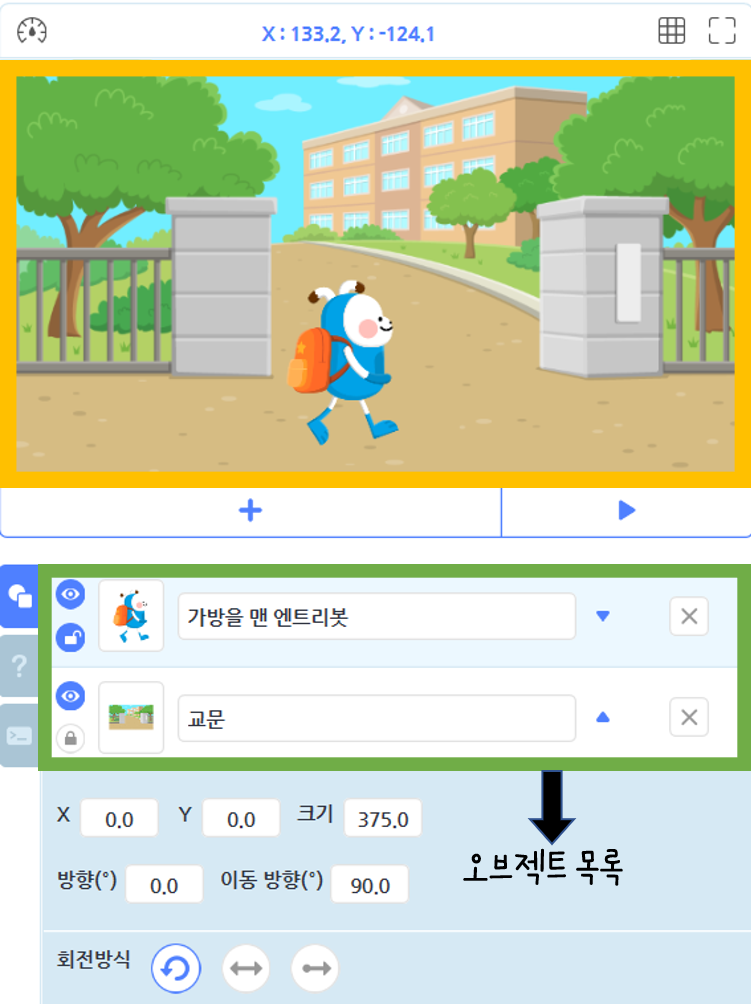 ‘오브젝트 추가하기’를 통해 “가방을 멘 엔트리봇”과 “교문(배경)” 두 개의 오브젝트를 추가해보았습니다! 실행 화면에 적용된 것 보이시나요?