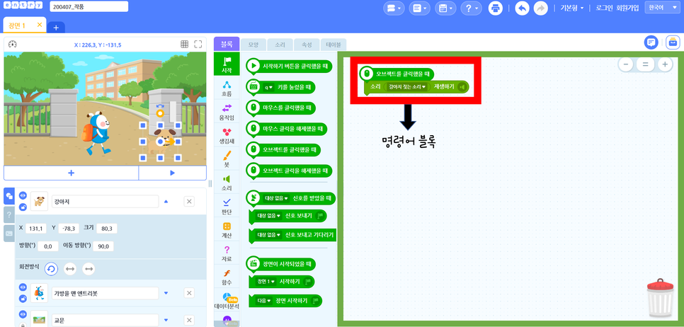 ”강아지” 오브젝트에 코딩된 명령어 블록입니다. “강아지” 오브젝트를 클릭하면 ‘강아지가 짖는 소리’가 나도록 코딩했습니다.