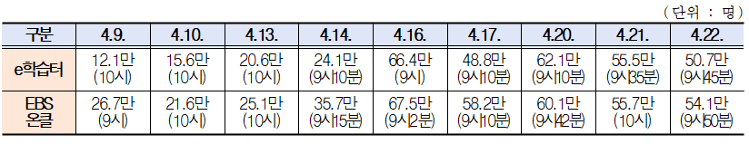 ※ EBS : 최고 접속자 수는 Google Analytics(실시간 활성 사용자 수) 산출 근거임