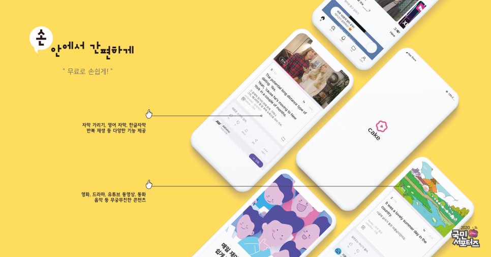 위 사진은 무료 영어학습 애플리케이션 <Cake>입니다. Cake는 유튜브, 영화, 드라마 등 흥미로운 영상들을 통해 보다 재미있게 언어를 학습할 수 있는데요. 자막 가리기, 영어 자막, 한글자막, 반복 재생 등 다양한 기능 역시 제공되고 있으며, 5만 명이 넘는 다운로드 횟수를 보유하는 등 높은 인기의 애플리케이션입니다.