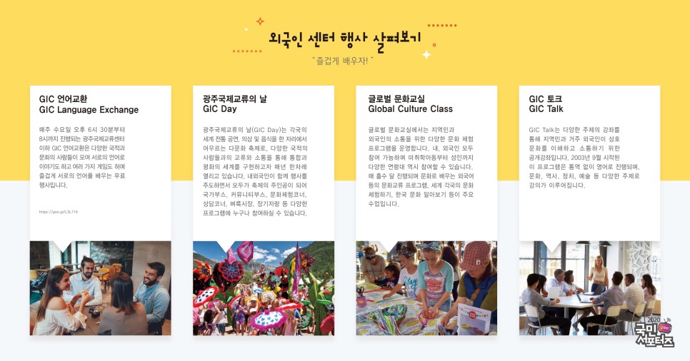 위 사진은 광주광역시에 위치한 '광주국제교류센터(GIC)' 내에서 운영하는 행사의 목록입니다. 현재 코로나바이러스감염증-19의 확산을 방지하고자 많은 행사들이 취소 및 연기되었지만, 이와 같은 기관에서 다양한 국적과 문화의 외국인들과 교류하며 배움을 실천할 수 있습니다.