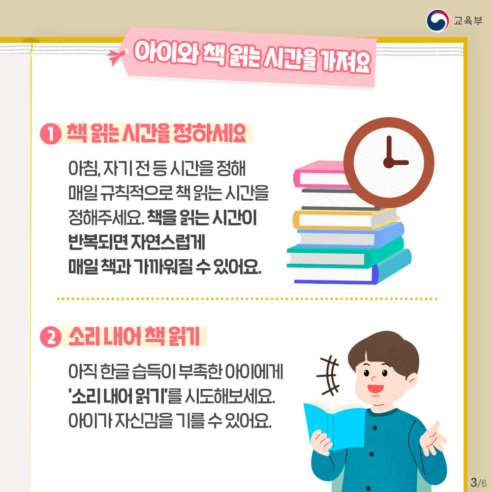 아침, 자기 전 등 시간을 정해 매일 규칙적으로 책 읽는 시간을 정해주세요.