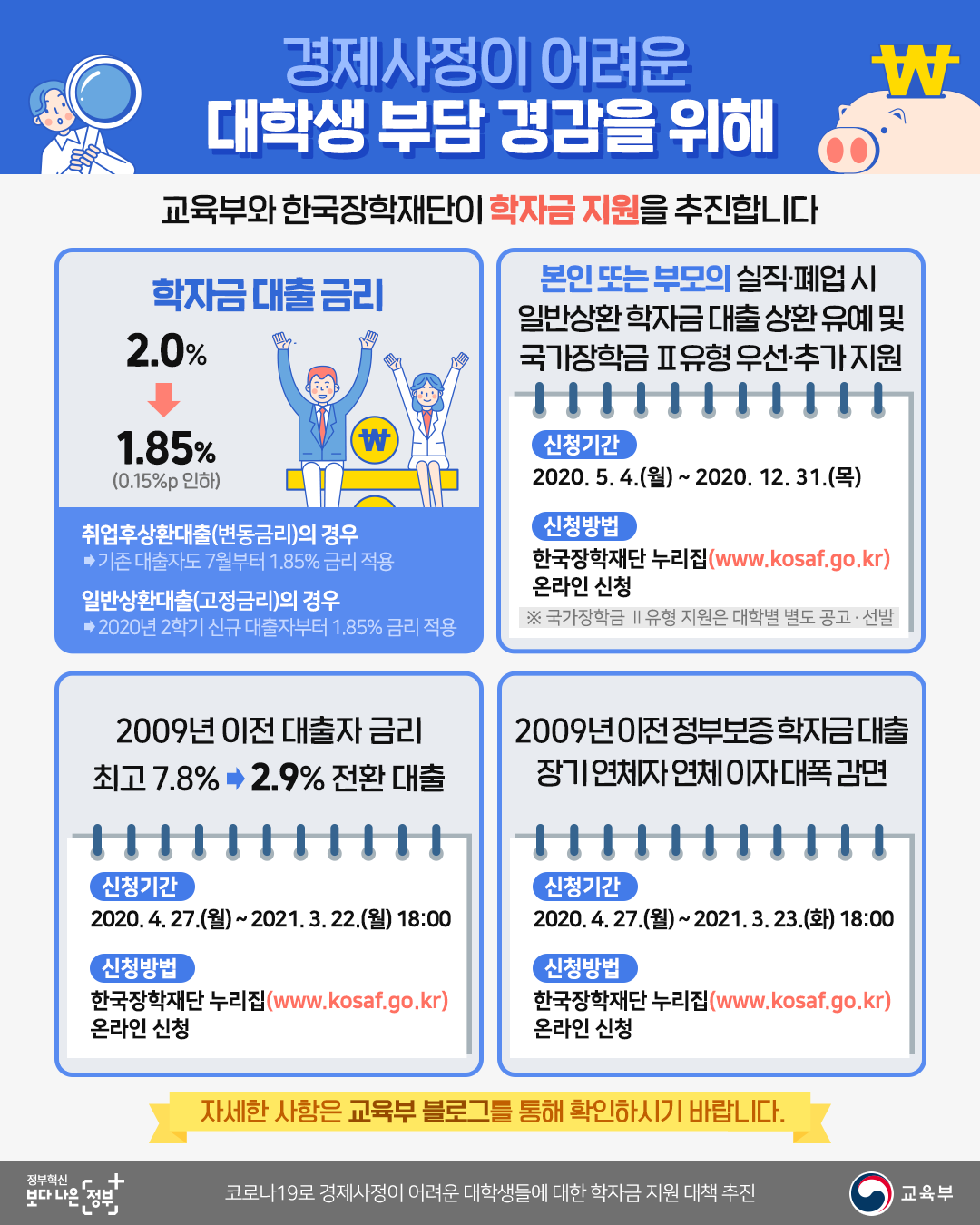 코로나19로 경제사정이 어려운 대학생들에 대한 학자금 지원을 추진합니다.
