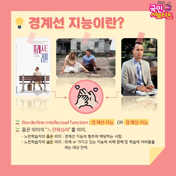 영화 <포레스트 검프>의 주인공 '포레스트 검프'가 경계선 지능에 해당하는 대표적 인물입니다. 영화 속 검프는 자신에게 익숙한 일이 아닌 복잡하고 어려운 과제를 처리하는 일에 어려움을 느끼는데요. 이는 뒤에 나올 경계선 지능 아동의 특성 부분에서 자세히 다루도록 하겠습니다.