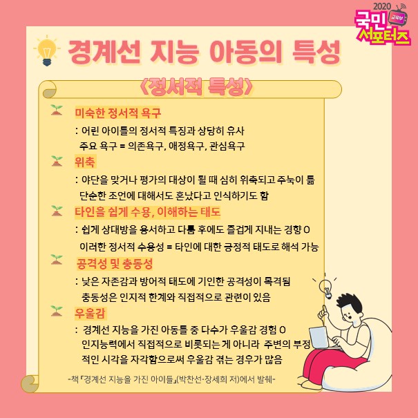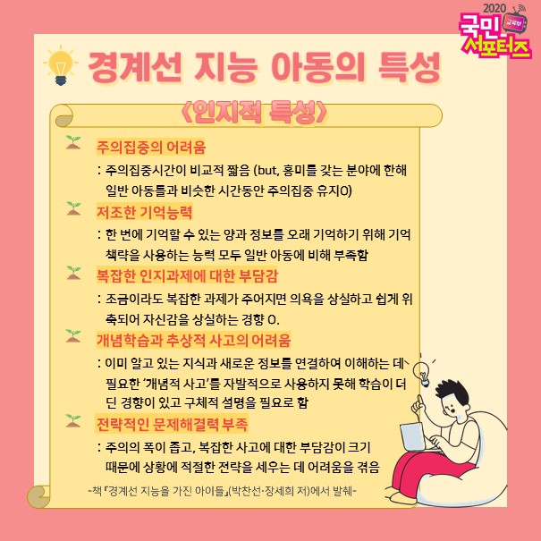 지금까지 경계선 지능의 모든 것을 알아보았는데요. 경계선 지능 아동에게도 동등한 배움의 장과 배움이 주는 기쁨을 안겨 주기 위해서는 우리부터가 그들의 특성을 잘 알아두어야 무지에서 비롯되는 편견과 낙인에 사로잡히지 않고 포용 국가로서의 면모를 발휘할 수 있으리라 생각됩니다,