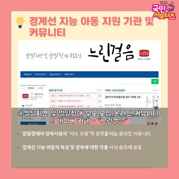 다음으로 네이버 카페 '느린걸음'은 발달지연 및 발달장애 부모 모임을 주제로 운영되는 온라인 커뮤니티로서 경계선 지능을 포함한 발달장애아 양육자들의 '자조모임' 기능을 합니다. 또한 고민 상담, 정보 공유 게시판을 통해 경계선 지능 아동의 특성 및 양육에 대한 각종 지식 습득에 유용하다는 장점이 있습니다.