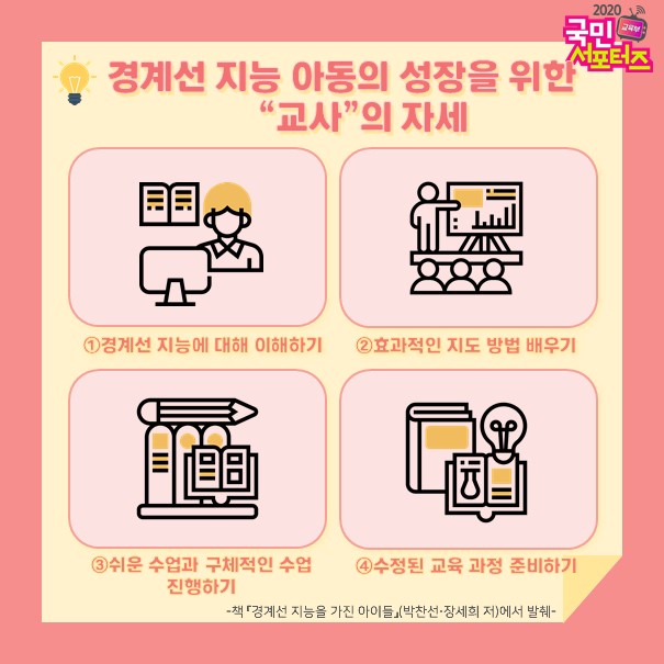 한편 교사는 전문성을 바탕으로 경계선 아동이 낙심하지 않고 학습에 있어 또래보다 뒤처지지 않도록 이끌어주는 역할을 수행해야 할 것입니다. 먼저 경계선 지능에 대한 올바른 이해를 바탕으로 그들의 욕구를 충족해 줄 수 있는 효과적인 지도 방법을 배워야 합니다. 또한 경계선 지능 아동을 배려하여 일반 아동을 가르칠 때 사용하는 수업 안보다 쉽고 구체적인 수업 안을 별도로 마련해두어 보충적인 학습을 돕는 것이 바람직합니다.
