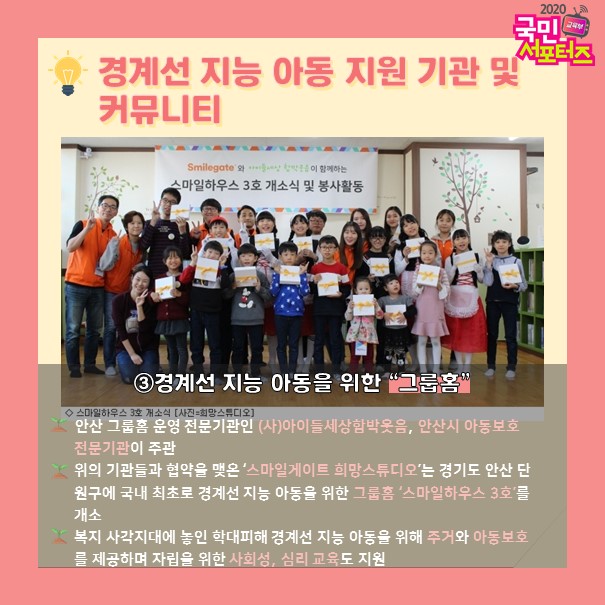마지막 프로그램은 '그룹홈'인데요. 이는 앞선 기관 및 커뮤니티와는 달리, 복지 사각지대에 놓일 위험이 있는 경계선 지능 아동들이 양육자로부터 적절한 보호를 받기 어려운 상황에 처했을 때 도움을 얻을 수 있는 프로그램이라는 점이 특징적입니다. 그중 하나인 안산의 '스마일하우스'는 학대 피해 경계선 지능 아동을 위해 주거와 아동 보호를 제공하며 자립을 위한 사회성, 심리 교육도 지원하고 있다고 합니다.