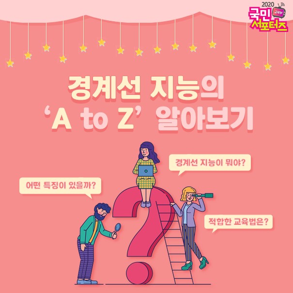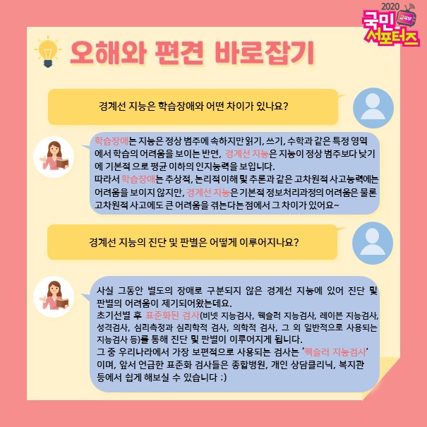 따라서 오늘은 경계선 지능을 주제로, 경계선 지능에 대한 오해와 편견을 바로잡고 경계선 지능에 대한 인식을 제고하고자 쉽고 간단한 카드뉴스를 가지고 왔어요. 지금부터 경계선 지능에 대해 함께 살펴볼까요?