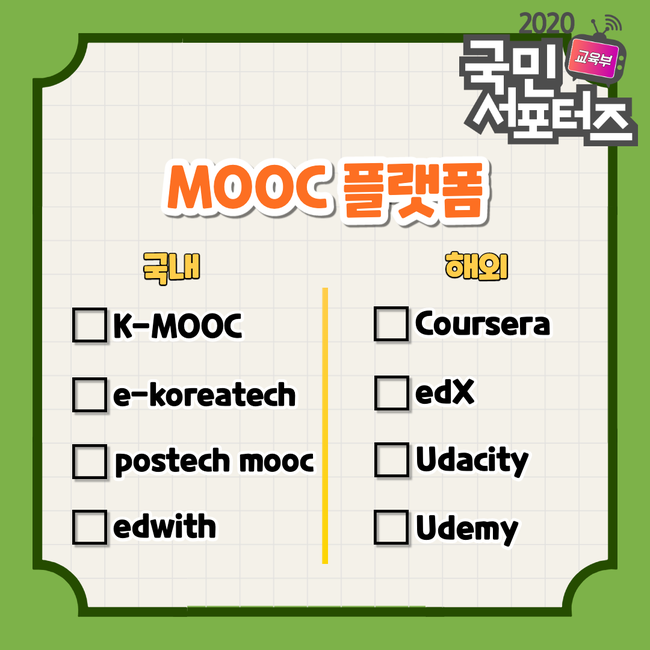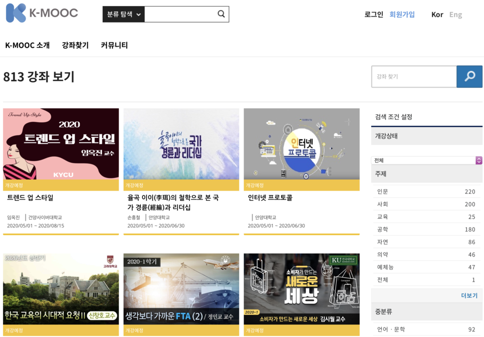 ‘K-MOOC’는 한국의 여러 대학이 무료로 동영상 강의를 제공하는 플랫폼입니다. 강의에 따라 학점 및 이수증을 발급하기도 하며, 수강자를 학교에 초청해 배운 내용에 대한 의문점을 해소할 기회도 줍니다. 인문, 자연, 사회, 의약, 예체능, 공학 등의 강좌가 주제에 따라 나뉘어 있고 세부 중분류 및 관심 분류 항목에서 희망 강좌를 선택할 수 있습니다. 800개 이상의 강좌가 있으며, 100개 이상의 대학과 공공기관 및 해외 기관에서 참여하였습니다.