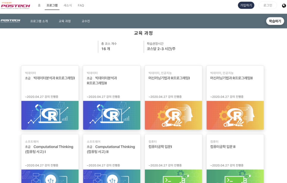 ‘postech mooc’는 POSTECH 정보통신대학원에서 제공하는 인공지능·빅데이터· IOT ·네트워크·소프트웨어 관련 MOOC입니다. 관심 있는 누구나 참여 가능한 형태로 강좌를 제공하고 있습니다. 전공에 상관없이 누구나 들을 수 있는 기초과정과 전공자 및 실무자 대상의 심화과정으로 나뉘어 있습니다. 온라인 기초과정 수료 기준을 충족한 학습자에게 수료증이 발급되며 특강은 예외입니다. 20여 개의 강좌가 있습니다.