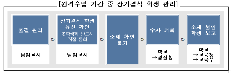 교육부는 지난 4월 초 ‘원격수업 출결·평가·기록 지침’을 학교에 안내하면서, 장기결석 학생들의 소재와 안전 확인을 위하여 담임교사가 학생들과 직접 전화 통화를 하고, 소재와 안전이 불확실한 경우 반드시 경찰에 수사 의뢰하도록 하였다.