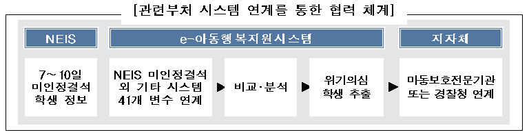 교육부는 연중 교육행정정보시스템(NEIS)을 통해장기결석 학생 현황을 학교-교육청-교육부가 공유하고, 이를 e-아동행복지원 시스템과 연계하여 아동학대위기 학생이복지서비스 등을 제공받을 수 있도록 복지부와 지속 협력할 예정이다.