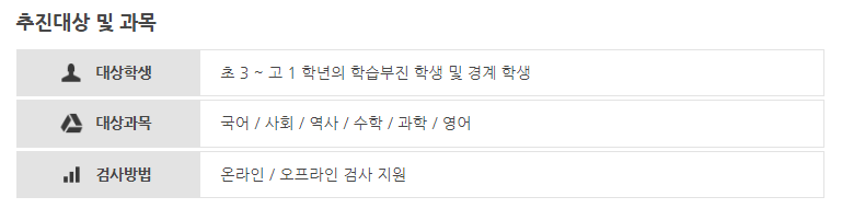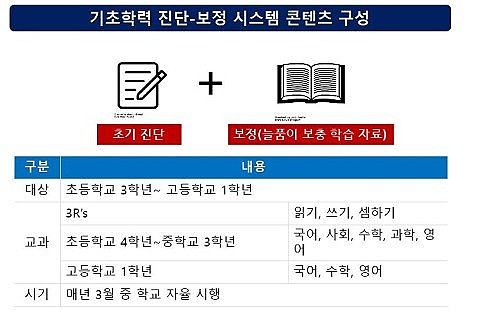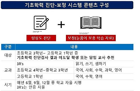 기초학력 진단-보정 시스템의 대상은 초등학교 3학년부터 고등학교 1학년까지입니다. 초등학교 3학년은 기본 3R’s를, 초4~중3까지는 국어, 사회, 수학, 과학, 영어를, 고1은 국어, 수학, 영어를 진단합니다.