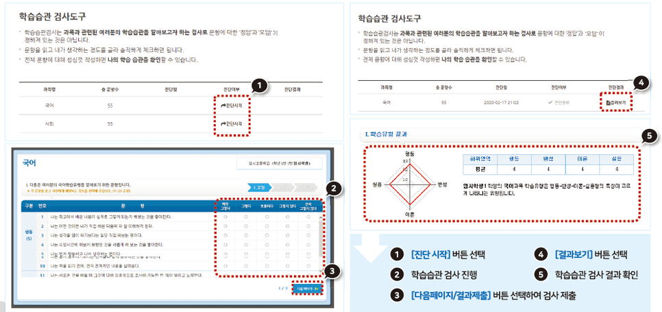 “학습습관 검사도구”는 초등 저학년, 고학년, 중등이 대상이며 학습 유형, 학습 전략, 학습 집중에 관한 입체적 리포트를 제공해줍니다.