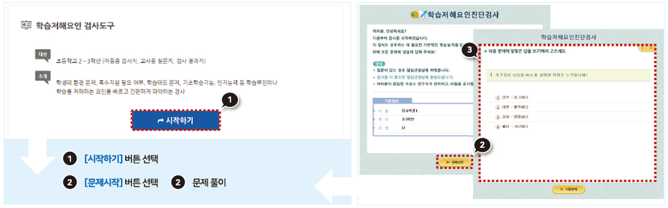 “학습저해요인 검사도구”는 초등학교 2~3학년을 대상으로 학생의 환경문제, 특수지원 필요 여부, 학습태도 문제, 기초학습기능, 인지능력 등 학습부진이나 학습 저해 요인을 빠르고 간편하게 파악하는 검사입니다.