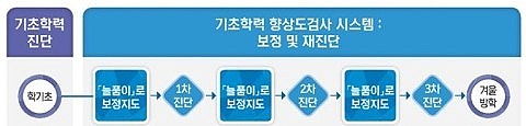 기초학력 진단-보정 프로세스는 간단합니다. 먼저 진단검사를 통해 기초학력 진단을 합니다. 부족한 부분을 학습(늘품이로 보정)하고, 1차 향상도 검사를 합니다. 또 보정지도하고 2차 향상도 검사를 합니다. 이런 반복 속에서 학습 부진 및 경계선상에 있는 학생들을 지도할 수 있습니다.