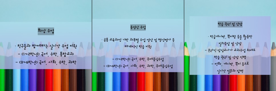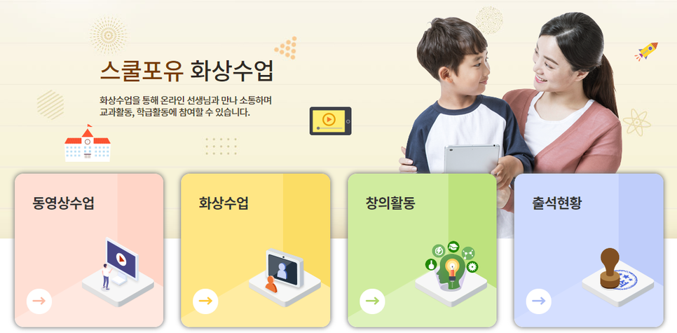 새로 개설된 스쿨포유 초등과정은 PC, 모바일, 태블릿PC 등 기기에 제한받지 않고 자유롭게 언제, 어디서나 쉽게 접근이 가능하며, 다양한 기능들이 구축되어 있다는 점이 큰 장점입니다. 학생들이 화상 수업, 동영상 수업에 참여하여 출석을 인정받을 수도 있고, 학급게시판, 쪽지함 등에서 교과별 질의응답, 상담 기능을 이용할 수 있다고 합니다. 학교를 가지 못하더라도 학교에서 어떤 일이 있었는지 알 수 있고, 선생님과의 소통을 통해 학습 진도를 맞추는 데에 무리가 없을 것 같습니다.