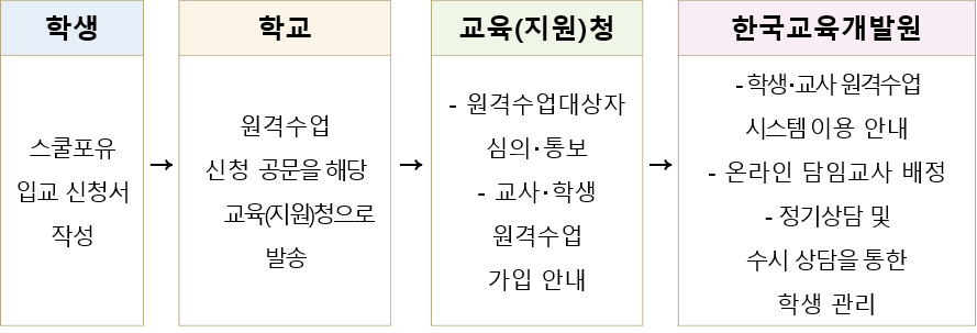스쿨포유를 이용하기 위해서는 다음과 같은 절차를 진행해야 하는데요. 스쿨포유를 이용하기 전, 학생은 신청서를 작성하여 소속 학교에 제출해야 한다고 합니다. 제출이 완료되면 학교에서 해당 교육지원청으로 신청하여 입교가 결정되는데, 이 때 회원가입을 하고 바로 학습을 시작할 수 있습니다.