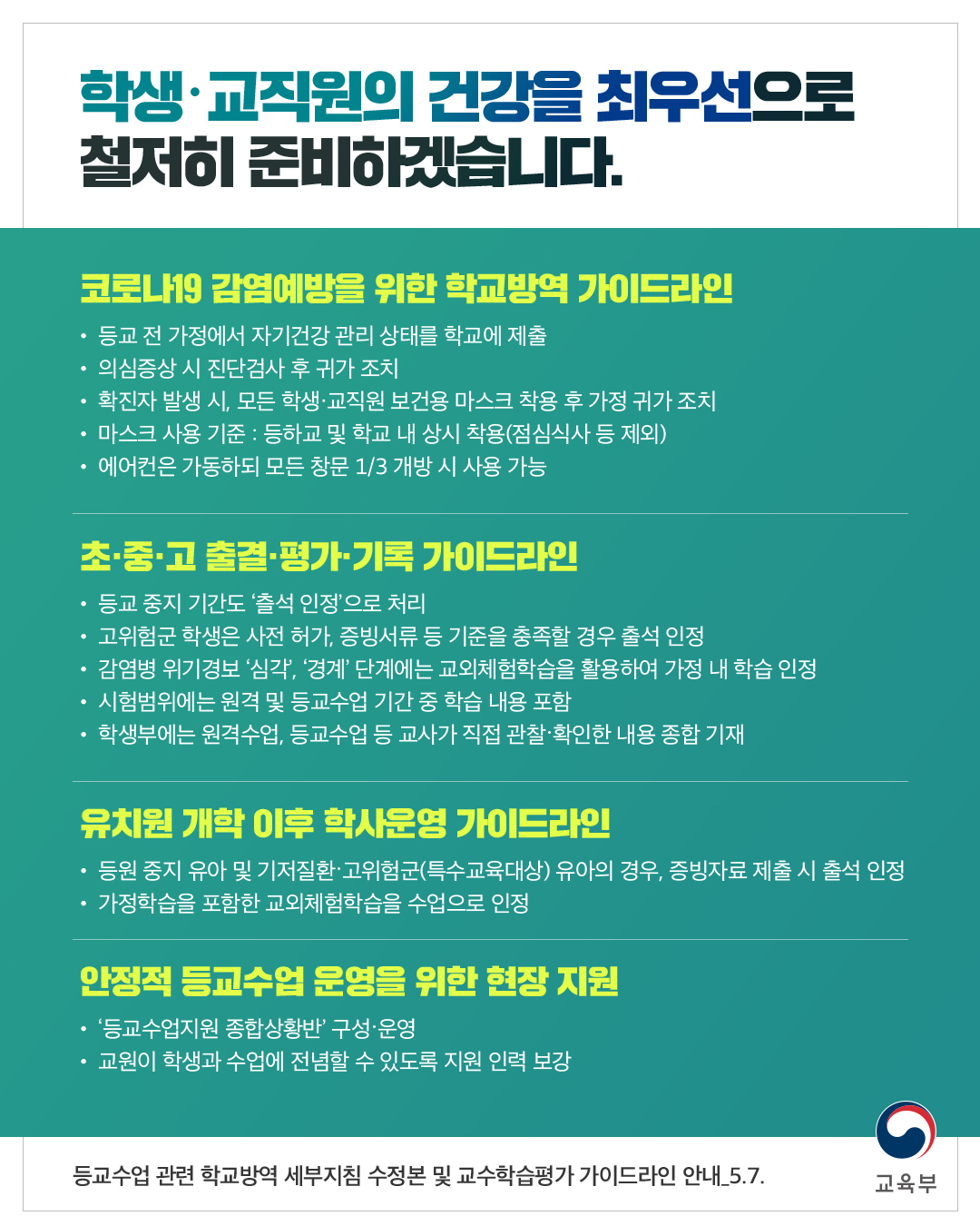 등교수업 전환 현장지원을 위한 방역 세부지침 개정판 및 교수학습평가 가이드라인 마련