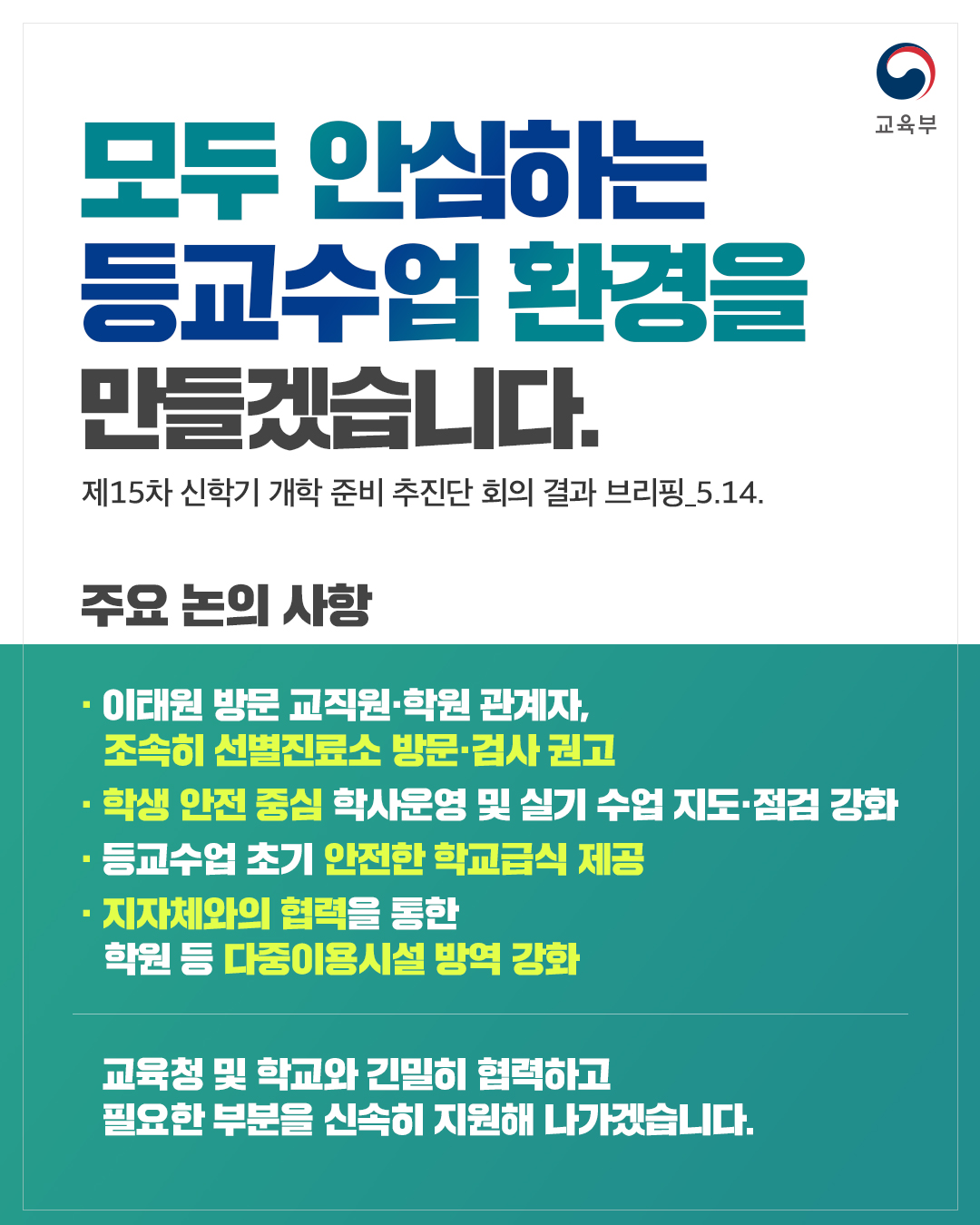 교육부는 시도교육청 부교육감과 함께 안정적인 등교수업을 위한 지원방안을 논의하였습니다. 향후, 교육청 및 학교와 긴밀히 협력하고 필요한 부분을 신속히 지원해 나가겠습니다.