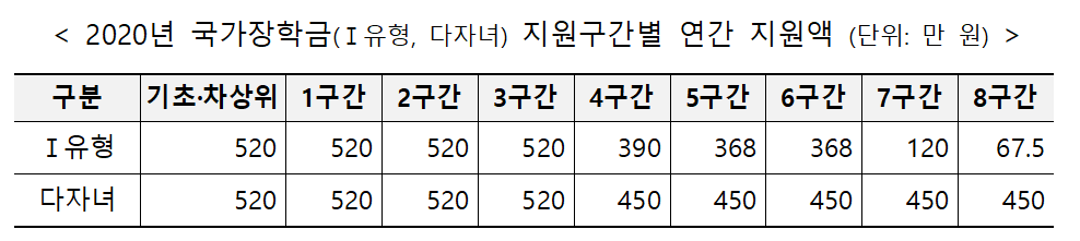 참고로, 2020학년도 1학기에는 약 142만 명의 대학생이 국가장학금을 신청하였고, 학자금 지원구간 심사 등을 통해 이 중 약 89만 명의 대학생들에게 약 1조 5,816억 원(1인 평균 약 178만 원)의 국가장학금(Ⅰ유형․다자녀)을 지원하였다.