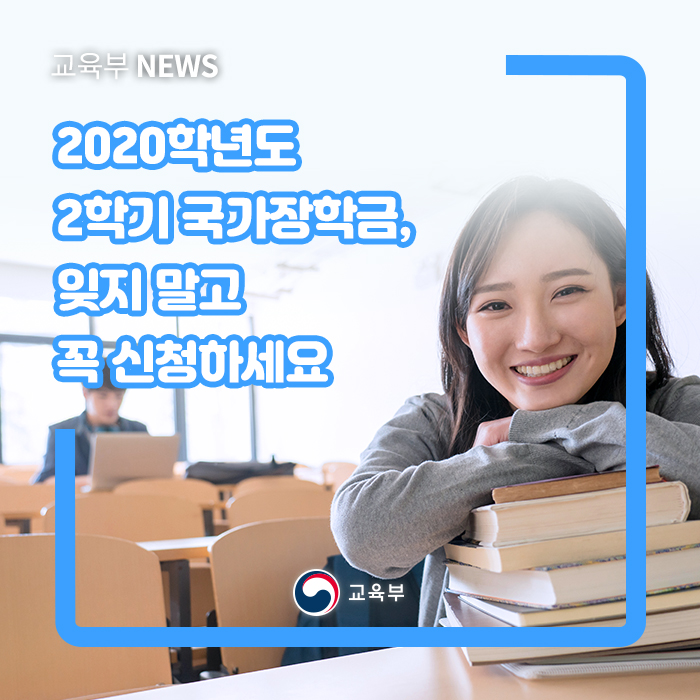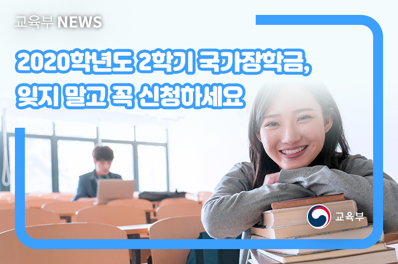 교육부(부총리 겸 교육부장관 유은혜)와 한국장학재단(이사장 이정우, 이하 재단)은 5월 20일(수) 9시부터 6월 18일(목) 18시까지 2020학년도 2학기 국가장학금 신청을 받는다.