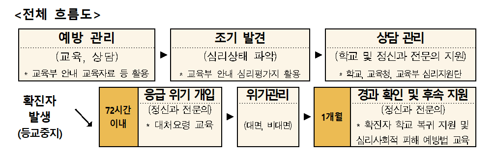 ☆ (상시 심리지원) 예방관리( 교육, 상담) → 심리상태 파악 → 학교내 관리 → 전문가(병의원) 지원 ☆ (등교중지 학교 위기관리) 응급 위기개입 (72시간 이내) → 위기관리 → 후속 지원 (1개월 후) |