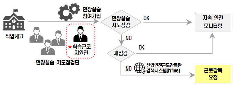 * 직업계고 1개교에 1명 이상의 교사를 대상으로 학습근로지원관을 지정하고, 산업안전근로감독관과 협업해 현장실습 기업에 대한 안전점검의 역할 수행