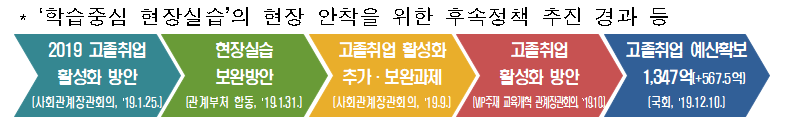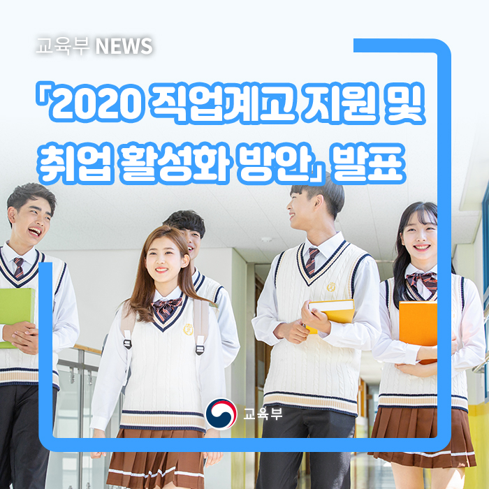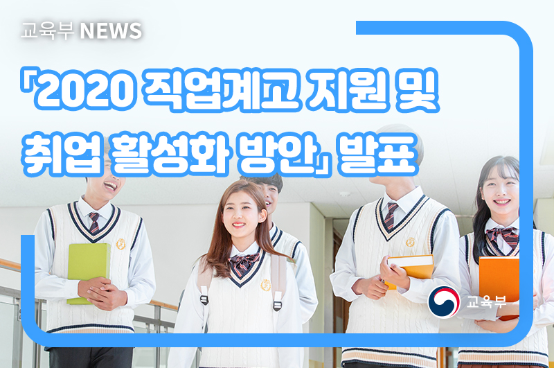 교육부(부총리 겸 교육부장관 유은혜)는 5월 22일(금)에 열린 제3회 사람투자인재양성협의회의에서 관계부처와 논의를 통해, 괜찮은 일자리 발굴, 기업참여 확대, 포스트(Post)-코로나19 대응력 강화 등의 계획을 담은「2020 직업계고 지원 및 취업 활성화 방안」을 발표했다.학습중심의 현장실습 전면 도입(2017.12.) 이후 정부에서는 고졸취업 활성화를 위한 다양한 정책적 노력*을 시도해 왔다.