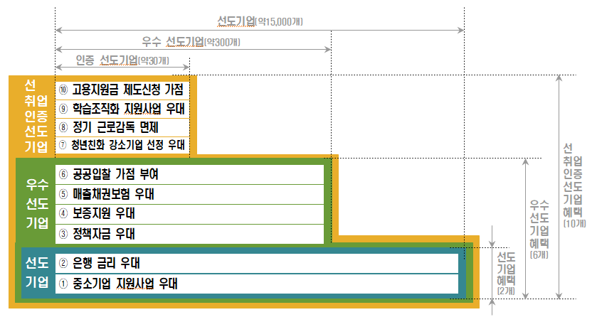세 번째로, 기업에 대한 인센티브를 대폭 개선하고 확대한다. 선도기업에는 중기부, 고용부, 금융위, 은행연합회, 조달청과 함께 최대 10개의 인센티브를 패키지*로 부여한다.
