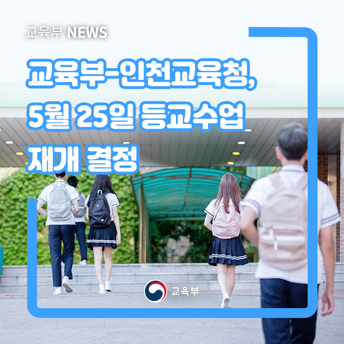 교육부(유은혜 부총리 겸 교육부장관)는 인천광역시교육청(도성훈 인천광역시교육청 교육감) 등과 5월 22일(금) 14시 영상회의를 하고, 인천광역시 5개구 66개 전체 고등학교에 대한 등교수업 재개 시기를 5월 25일(월)로 결정하였다.