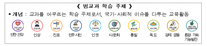 특히, 올해는 범교과 학습의 이수 시수를 절반 이하로 축소하고, 교과 및 범교과 주제 간 통합‧운영 등을 통해 범교과 학습을 탄력적으로 편성‧운영할 계획이다.