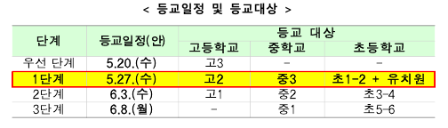 앞서, 교육부는 지역 감염 추이, 현 의료체계상 통제가능성 등을 고려할 때, 등교 수업이 가능하다는 질병관리본부 등 방역당국과 협의를 거쳐 5월 20일, 고3을 시작으로 순차적 등교 수업을 개시하였다.