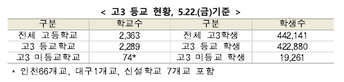 이에, 전국 고등학교 3학년의 등교수업을 5월 20일부터 시작하여, 전국 2,363개 고교 중 일부 학교*를 제외한 대부분의 학교에서 정상적인 등교 수업이 실시되고 있다.