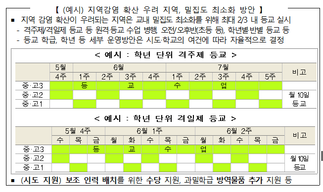 특히, 지역 감염 우려가 확산되는 지역 소재 학교는 교내 등교 인원이 전체 학생의 2/3를 넘지 않도록 시도교육청에 강력 권고하였다.
