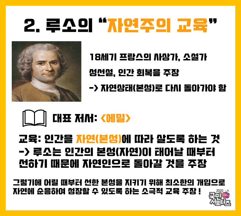 두 번째 인물은 장자크 루소입니다.루소는 인간이 태어났을 때부터 선하다는 성선설을 주장한 학자로 유명하죠!성선설과 자연(즉 인간의 본성)을 되게 중요시 했던 그는 이러한 자연에 따라 순응하며 살아야함을 강조하였죠.교육은 이러한 자연을 지키고,사회에서 인간이 자연인으로 살아갈 수 있도록 돕는 것이라고 정의하였습니다.