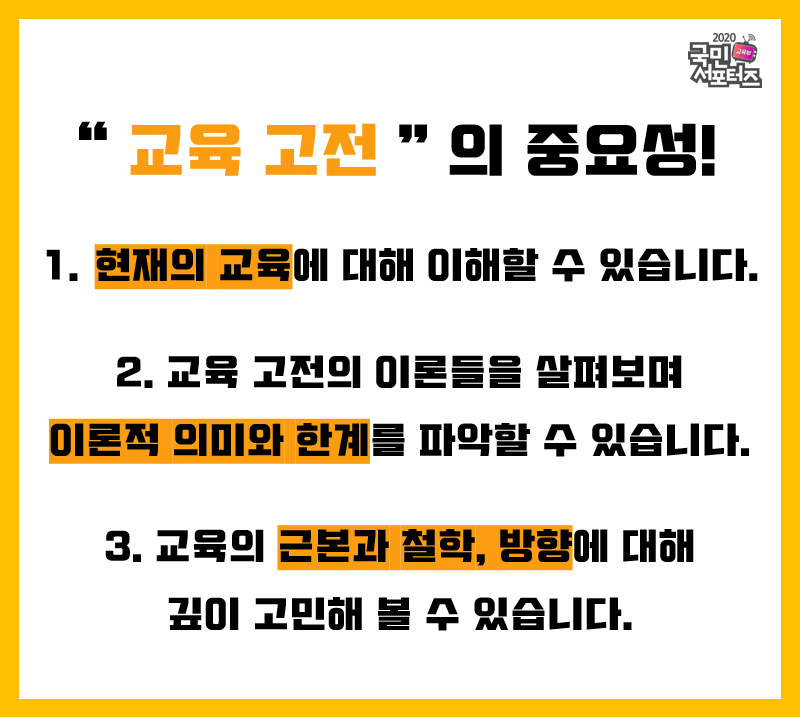 -교육고전은 여러 철학자들이 이에 대해 깊이 고민한 내용을 담고 있어 교육에 대한 방향을 깊게 생각 해 볼 기회를 주기도 합니다.