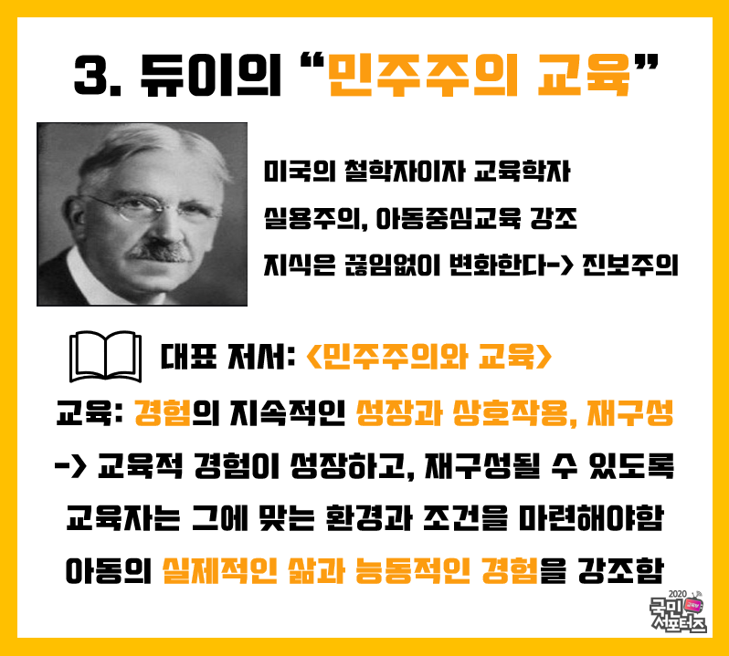 마지막으로 존 듀이에 대해 알아보겠습니다!존 듀이는 미국의 철학자이자,현대 교육학의 아버지로 불릴 정도로 현대 교육에 영향을 많이 끼쳤던 사람입니다.듀이는 지식은 끊임없이 변화하기 때문에 교육 역시 그에 맞추어 변화해야 한다는 진보주의 교육과 민주주의 사회에 적절한 교육을 강조했습니다.