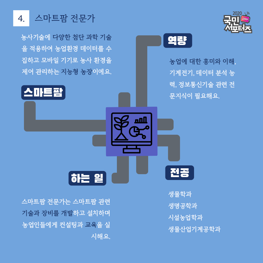 스마트팜은 농사기술에 다양한 첨단 과학 기술을 적용하여 농업환경 데이터를 수집하고 모바일 기기로 농사 환경을 제어‧관리하는 지능형 농장으로,스마트팜 전문가는 스마트팜 관련 기술과 장비를 개발하고 설치하며 농업인들에게 컨설팅과 교육을 실시합니다.